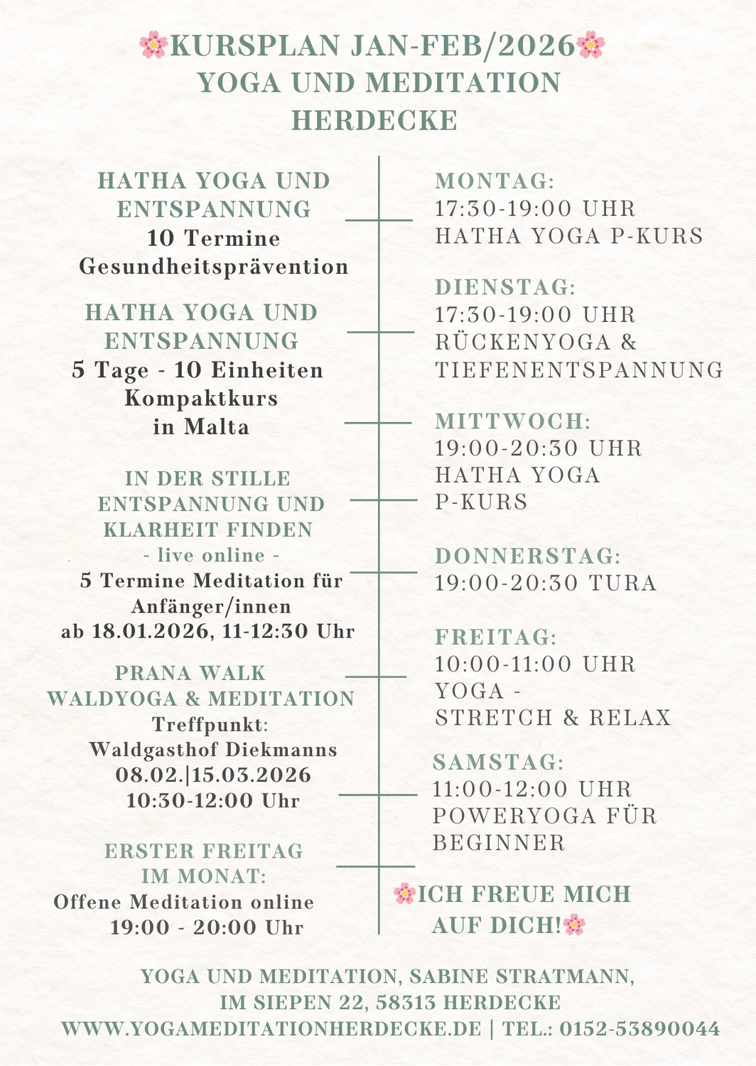 In diesem 10-wöchigen Kurs erlernst Du sanfte Körperübungen und Entspannungstechniken aus dem Hatha Yoga (z.B. Yoga Nidra, Progressive Muskelentspannung nach Jakobsen), um geistige und körperliche Entspannung herbeizuführen. Durch die Wahrnehmung des eigenen Körpergefühls erkennst Du Deine physischen und psychischen Ressourcen. Du erlernst Atemtechniken, die zu Achtsamkeit für den Körper und Entspannung in Körper und Geist führen. Dadurch können Teilnehmende, die erhöhtem Stresserleben ausgesetzt sind, wie z.B. in Büros Arbeitende aller Altersgruppen und Geschlechter, Führungskräfte vieler Berufsgruppen, Alleinerziehende und im Homeoffice arbeitende Menschen frühzeitig Stress wahrnehmen und z.B. Burnout und weiteren ernsthaften stressbedingten Krankheitsbildern vorbeugen. Am Ende jeder Yogastunde erfährst Du tiefe Entspannungsmomente und fühlst Dich frisch, gestärkt und erholt.