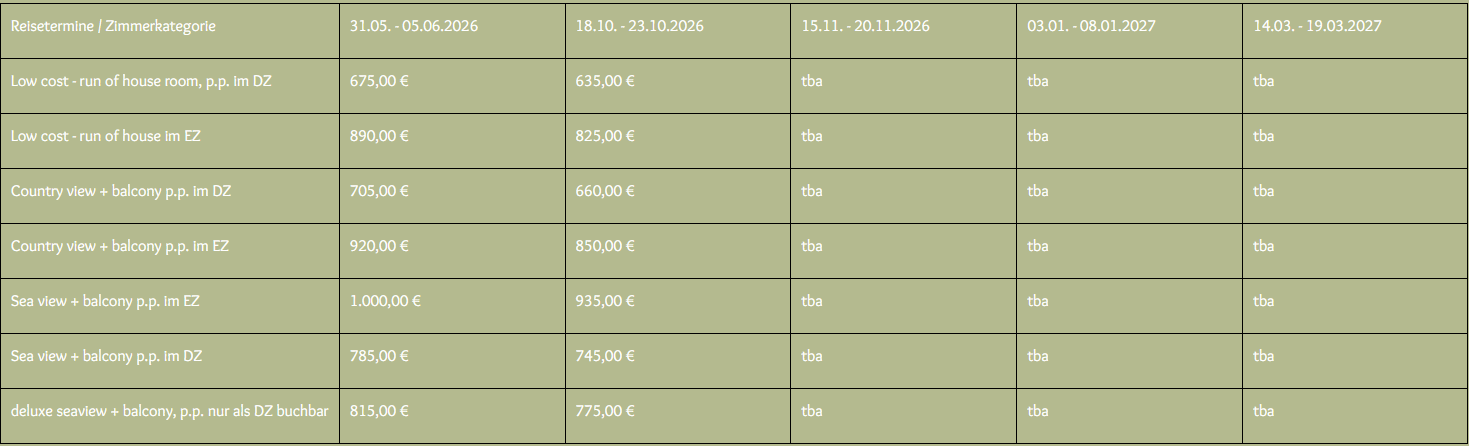 Die Preise beinhalten die Kursgebühr, die Betreuung und Organisation vor Ort, sowie die Verpflegung in unserem Hotel Riviera Spa Ressort - Adults Only mit reichhaltigem Frühstücks- und Abendbuffet. Ohne Flüge und Extras.